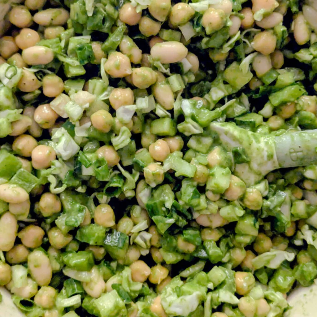Drain beans and chickpeas and dry thoroughly with paper towels.