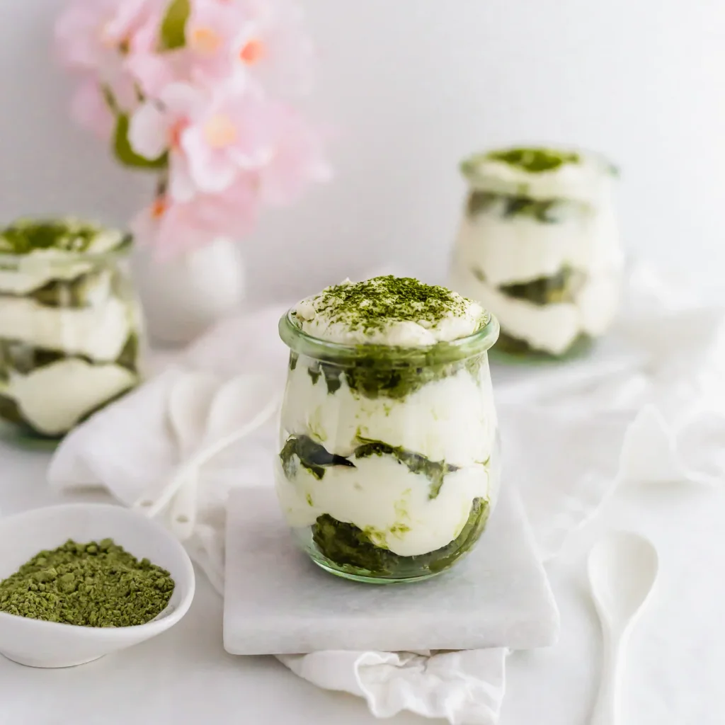 Chill briefly before serving and dust with extra matcha powder.
