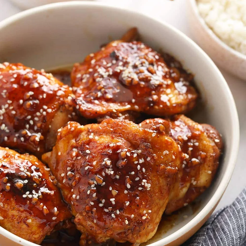 Sticky honey garlic chicken with glossy sauce and caramelized edges.